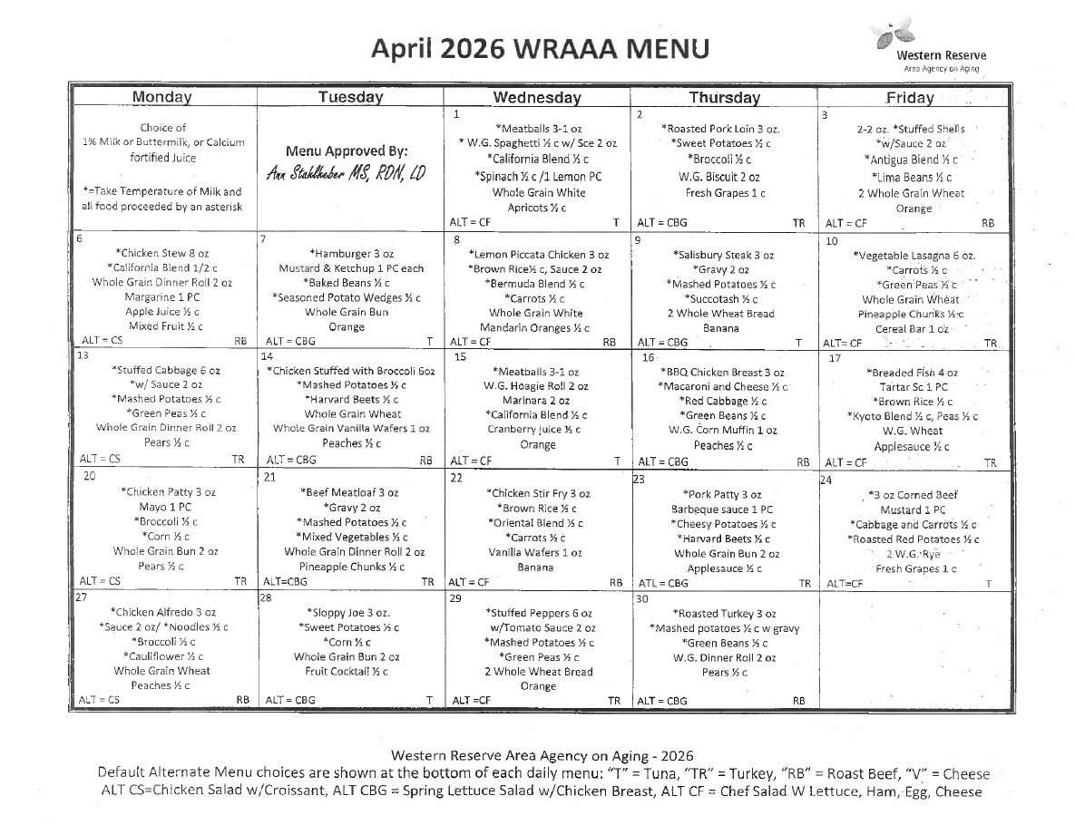 Our goal is to provide a hot, nutritious, well-balanced lunch. Each meal contains at least one-third of the recommended daily nutritional allowance for older adults. The menu is planned for those individuals on a mild sodium restricted diet, 2,000 mg. Our menu is not suitable for those on a diet severely restricted in sodium, 1,000 mg. or less.