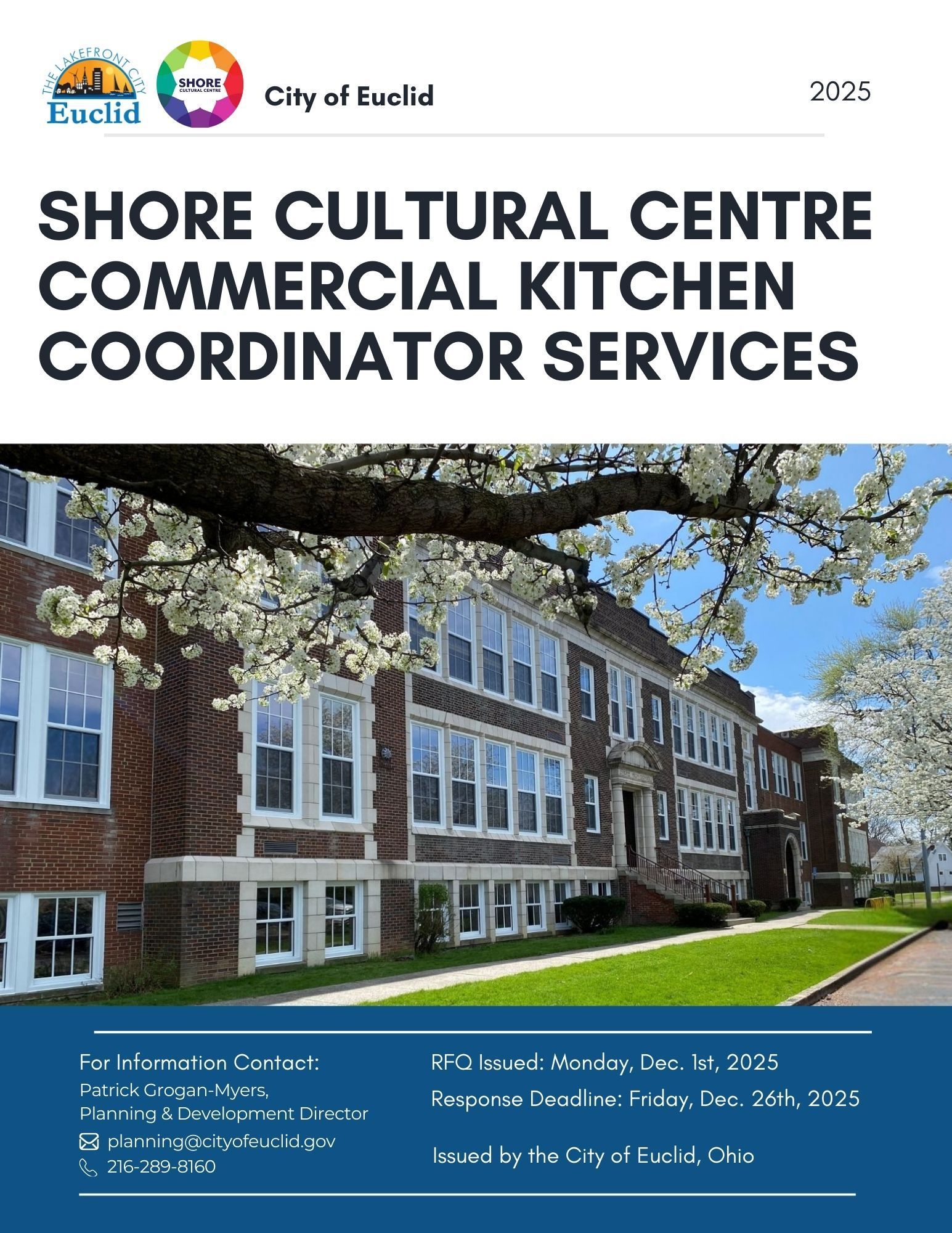 The Planning and Development Department of the City of Euclid invites submissions for the selection of a Kitchen Coordinator/Operator for the Commercial Kitchen at the Shore Cultural Centre. The Kitchen Coordinator/Operator will be responsible for the management and day-to-day operations of the Commercial Kitchen; details of the responsibilities are defined in the complete RFQ document.
